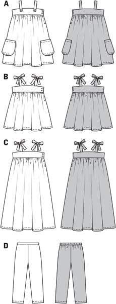 Stylish sleeveless dresses in different lengths, buttoned on the yoke, with gathered swingy skirts. A with nice pockets and buttoned straps. B & C with tied straps. Pants with elastic waistband in a matching colour.