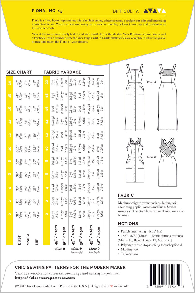View (A) features a bra-friendly bodice and midi-length skirt with side slits. View (B) features crossed straps and a low back, with a mini or below knee-length skirt. All skirts and bodices are completely interchangeable so you can mix and match the Fiona of your dreams.