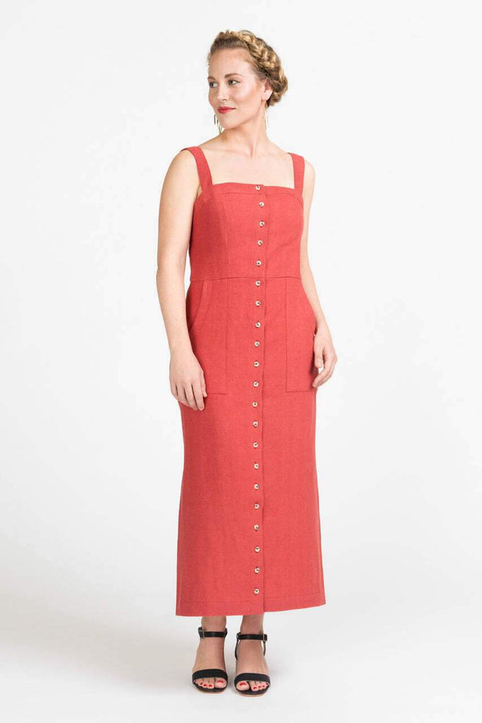 Our lovely Fiona is a fitted button-up sundress with shoulder straps, princess seams, a straight cut skirt and fetching topstitched details. Wear it on its own during warm weather months, or layer it over tees and turtlenecks as the weather cools.
