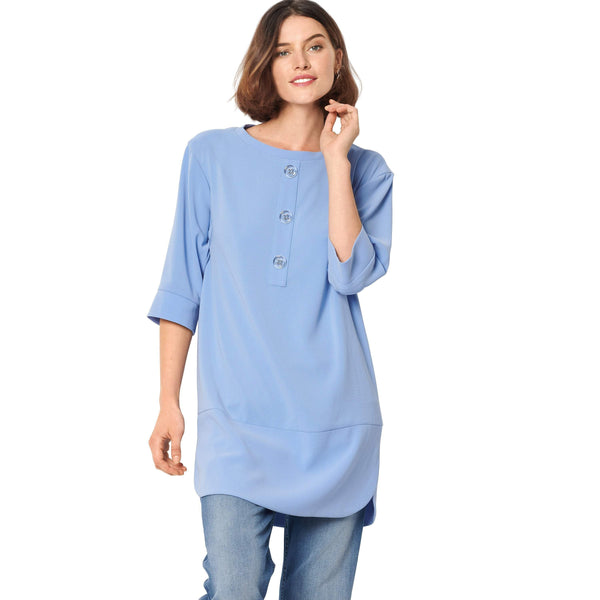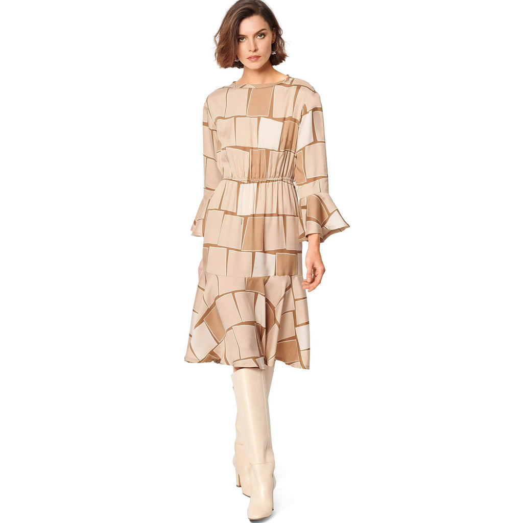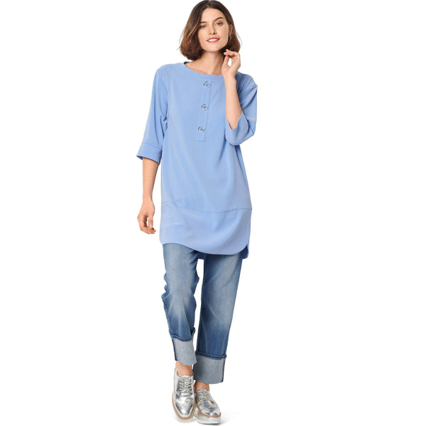 The tunic top in a casual, sporty style is detailed with decorative bands at the neckline and on the sleeves. The hem slits are rounded off and remind us of men’s shirt styling. The softly draping flounces at the sleeves and hem of the dress lend a charming youthful touch. An elastic at the waist flatters your figure. Fabrics: Cotton fabrics, blends, crêpe fabrics.