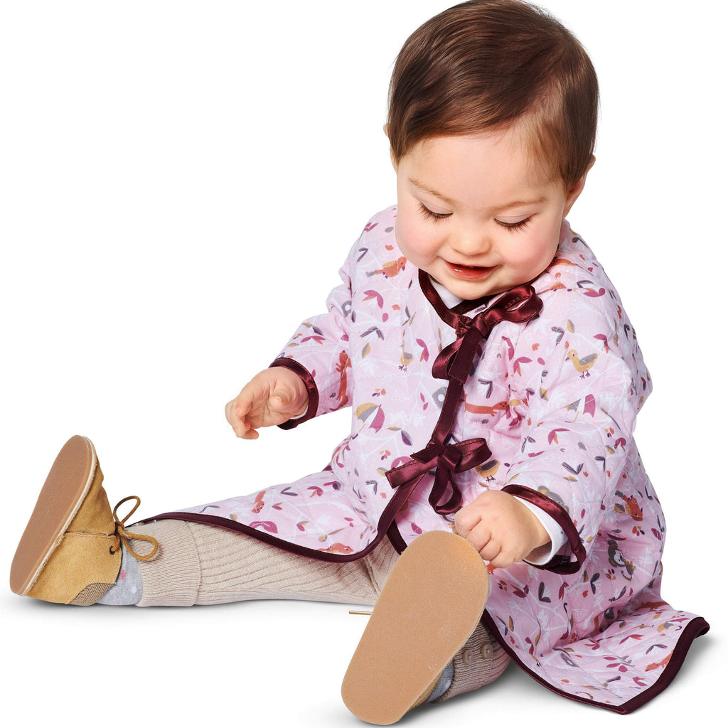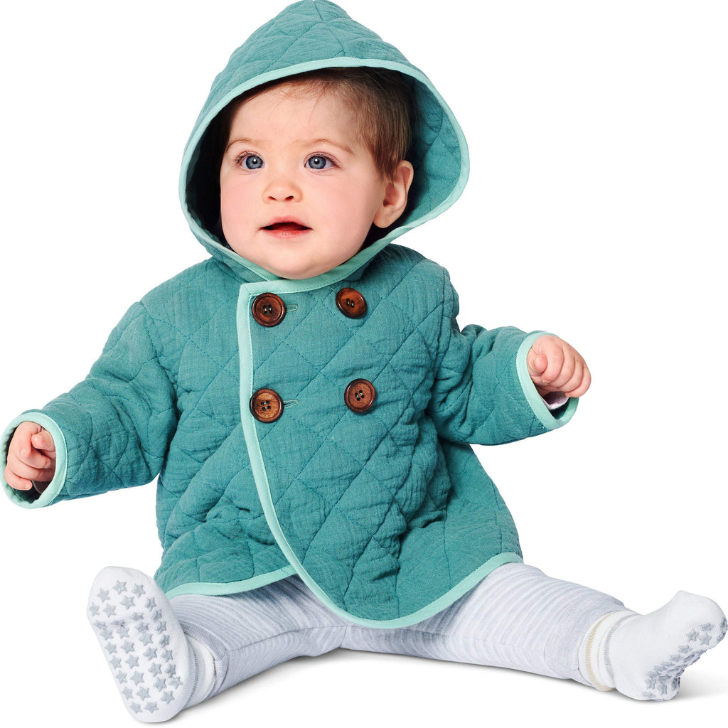 Such sweet outer garments to keep toddlers warm and cosy! Jacket view A features a hood and a double breasted button fastening. Coat view B has a round neckline to allow a hoodie to be comfortably layered underneath. The tie bands are a real highlight here. Fabrics: Quilted fabrics, matelassé, fiber fleece, double weave.