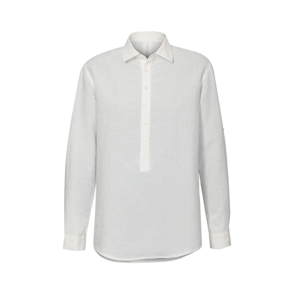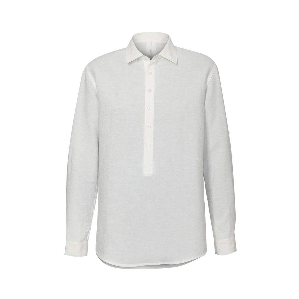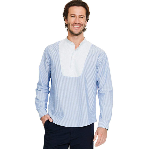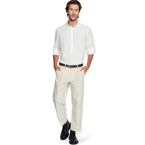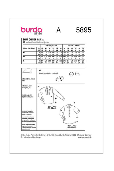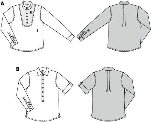 Comfortable slip-on tops for him. View A features a plastron and stand collar. View B has a polo fastening and a classic collar with a collarband. The detailed sleeve plackets are worth the extra effort.