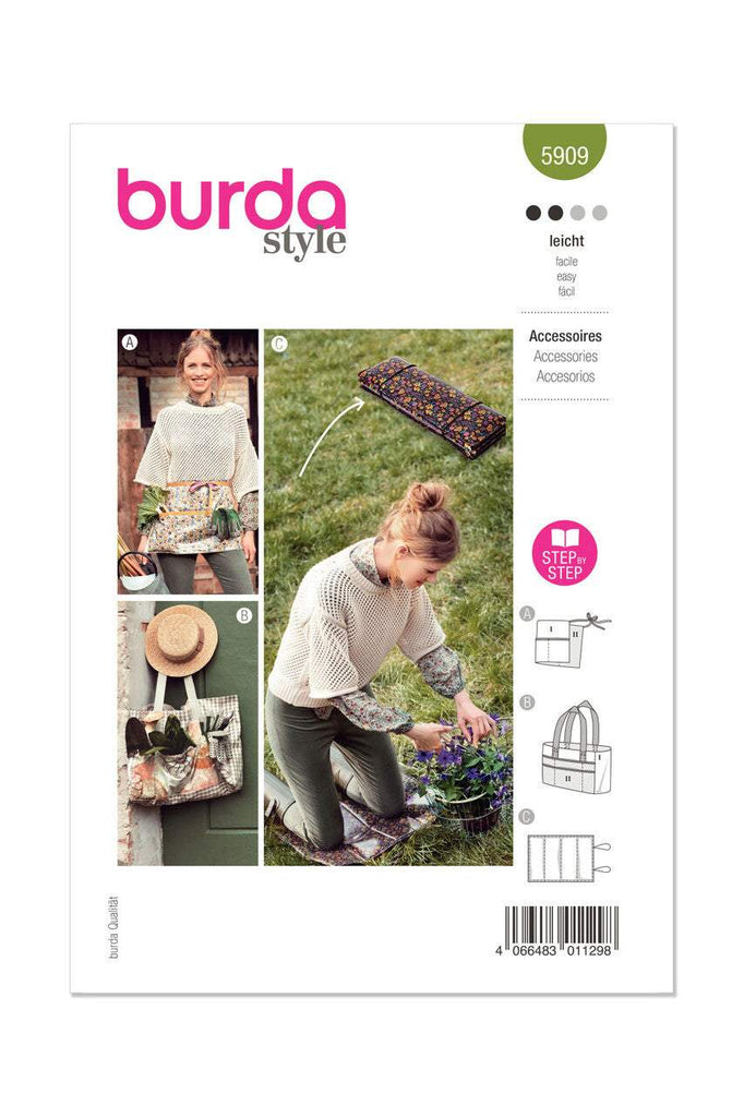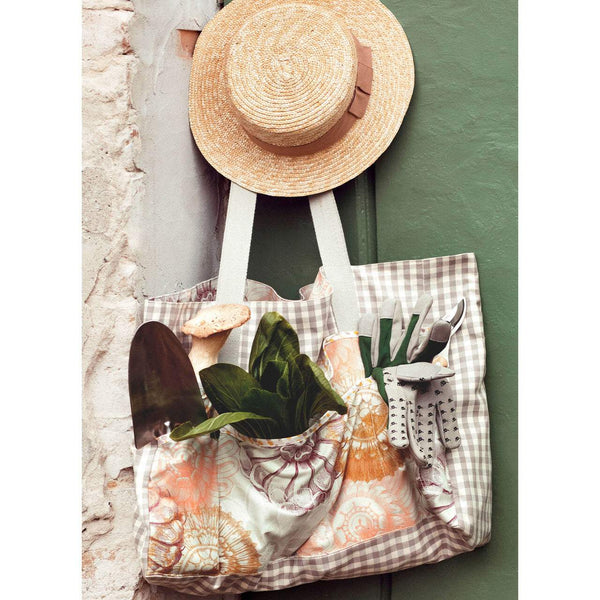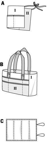 Garden lovers will adore these practical accessories. Small apron A with pockets for your pruning shears and gardening gloves is fastened with tie bands. A fold-up kneeling cushion will serve you well while weeding. Both can be stowed in the roomy tote bag C with its outside pockets. These accessories would make a great gift for nature lovers with a green thumb.