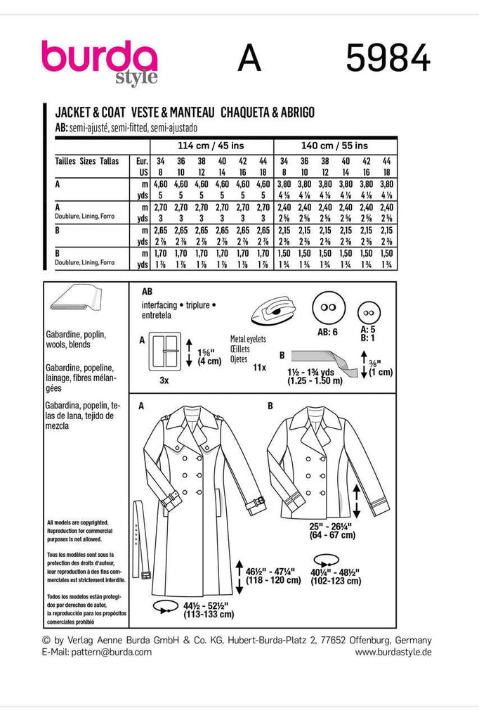 Burda - 5984 Ladies Caban Jacket and Trench Coat