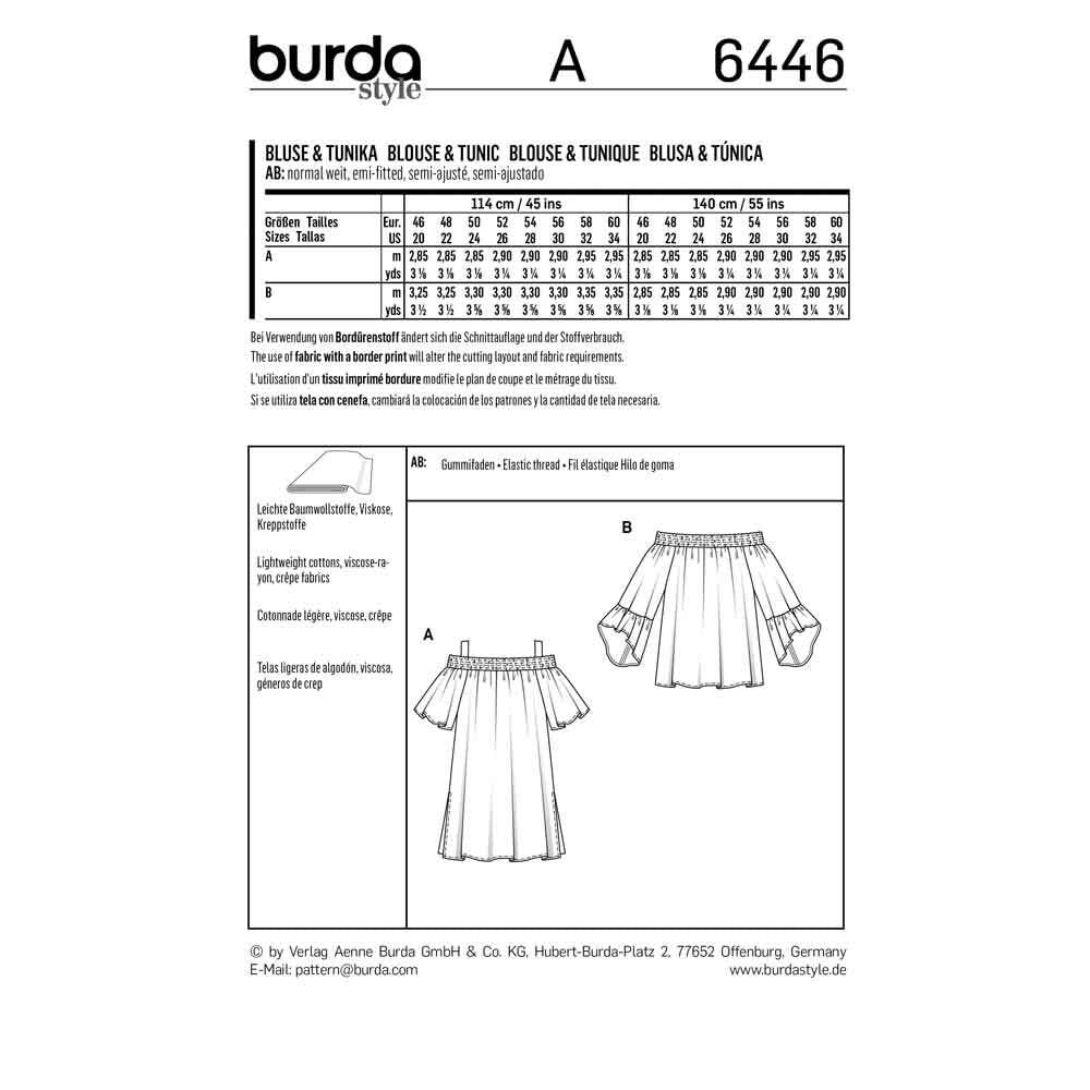 Burda - 6446 Blouse, Tunic Top - Shirred Neckline, Sleeve Frills