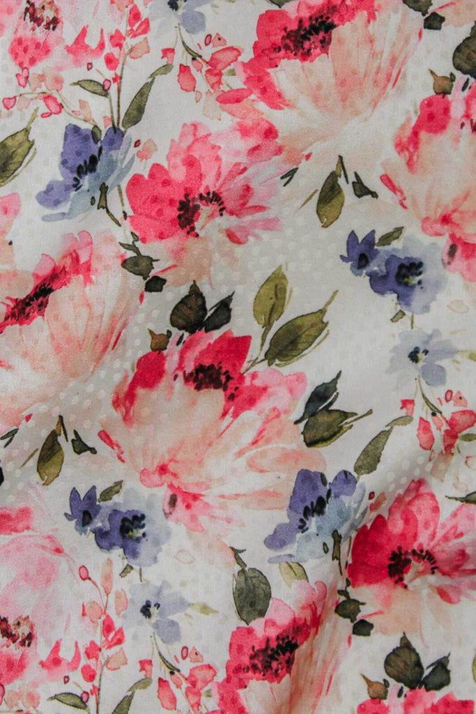 This lightweight satin features a digital floral print over a dot jacquard. With a slight stretch across the width it is perfect for shirts, dresses, robes, skirts, lingerie and more. It also makes a beautiful feature lining fabric for jackets.